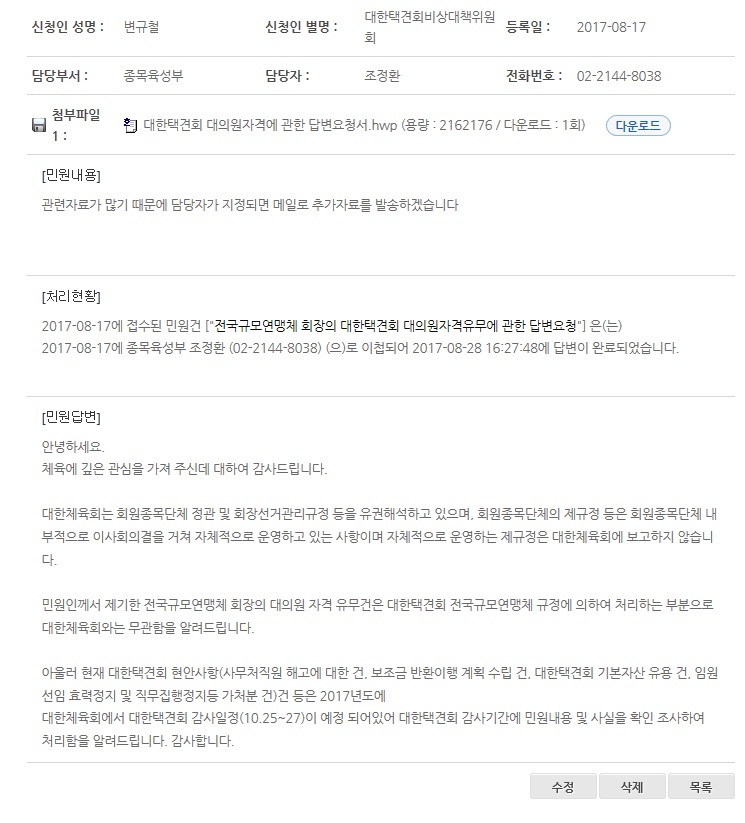 체육회의 승인사항이라 택견회에는 권한이 없다는 사무처의 공지