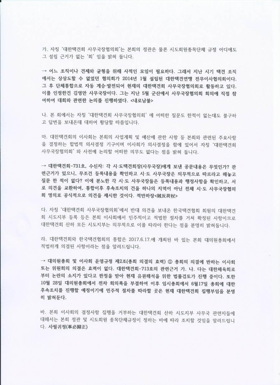 바. 본회 이사회의 결정사항 집행을 거부하는 대한택견회 산하 시도지부 사무국 관련자들에 대해서는 본회 정관 및 시도회원 종목단체규정이 정하는 바에 따라 조치할 것임을 알려드립니다. 사필귀정(事必歸正)