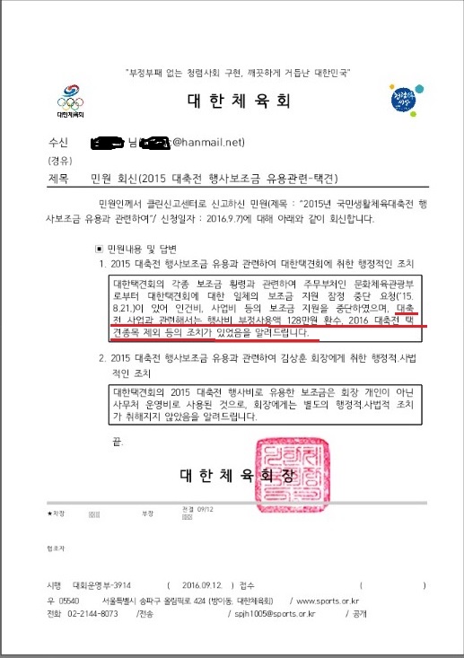 회장으로서 대축전 보조금 유용에 대해서 어떻게 책임질 것인지 성실한 답변을 촉구한다.