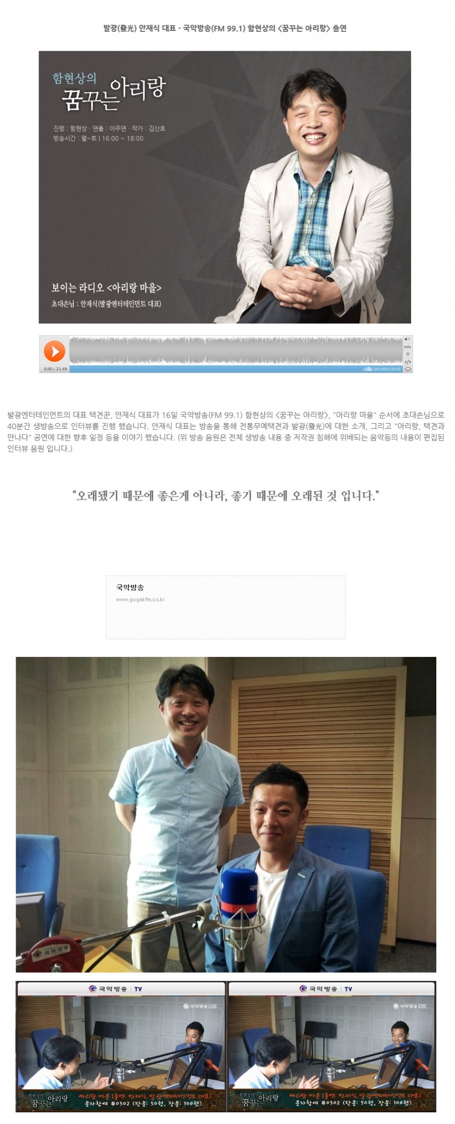 발광엔터테인먼트의 대표 택견꾼, 안재식 대표가 16일 국악방송(FM 99.1) 함현상의 <꿈꾸는 아리랑>, “아리랑 마을” 순서에서 초대 손님으로 40분간 생방송으로 인터뷰를 진행하였습니다.