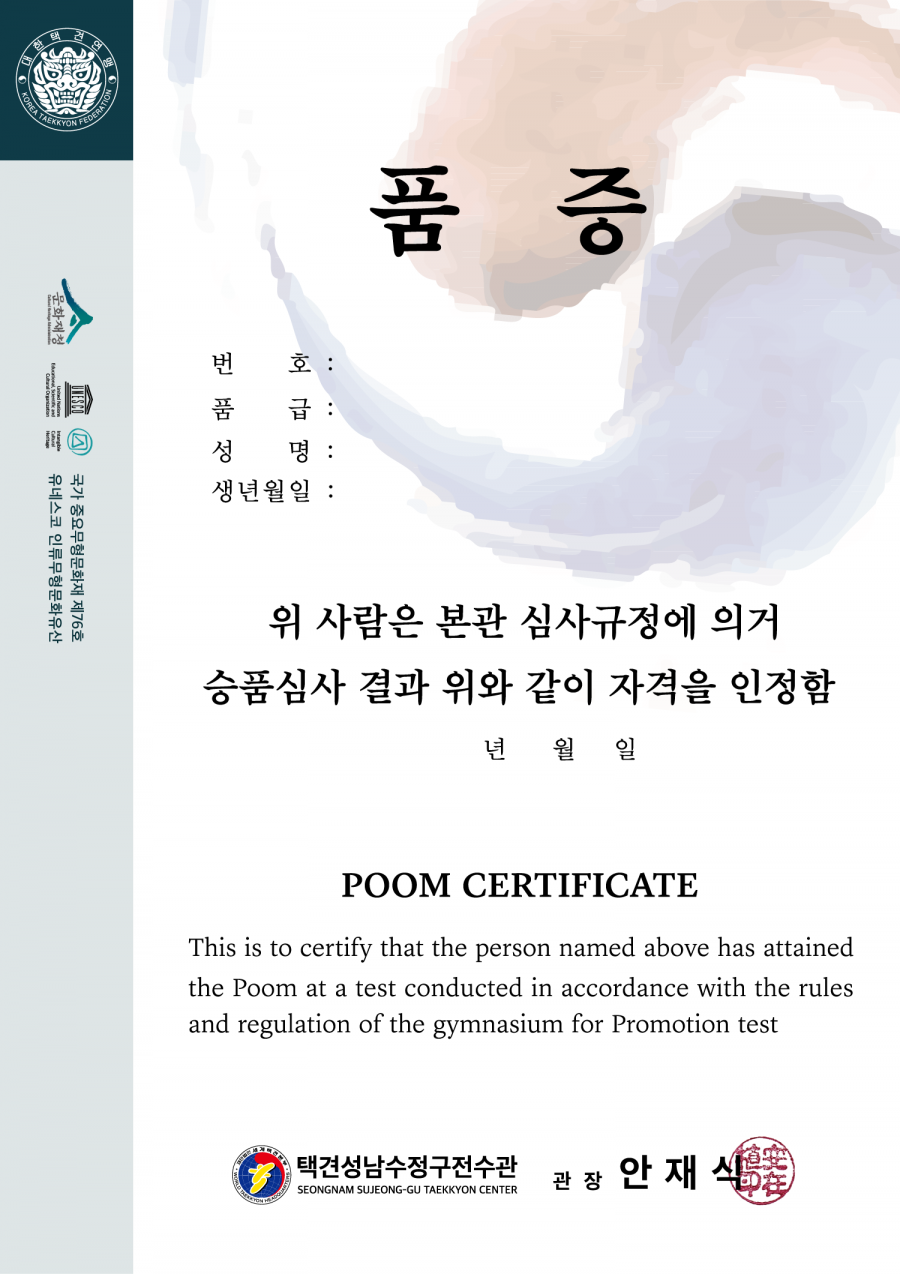 또한 다른 무도종목에서 발급되는 품, 단증의 디자인과 비교하여 택견 품증의 디자인 개선은 시급다는 생각입니다.