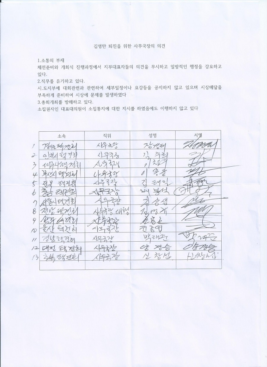 김영만 사무국장의 사퇴를 요구하는 각 시,도 사무국장들의 의견입니다.
